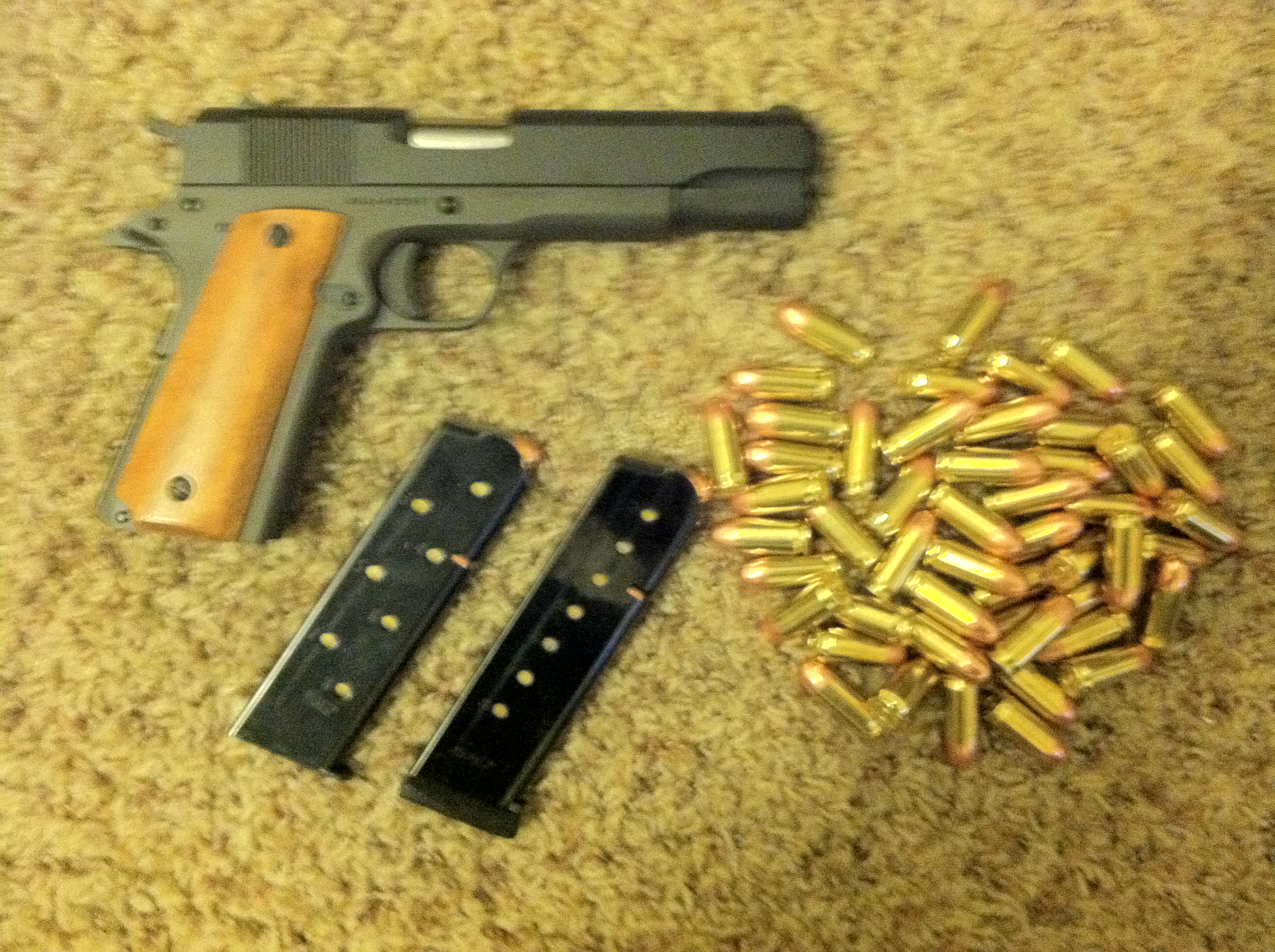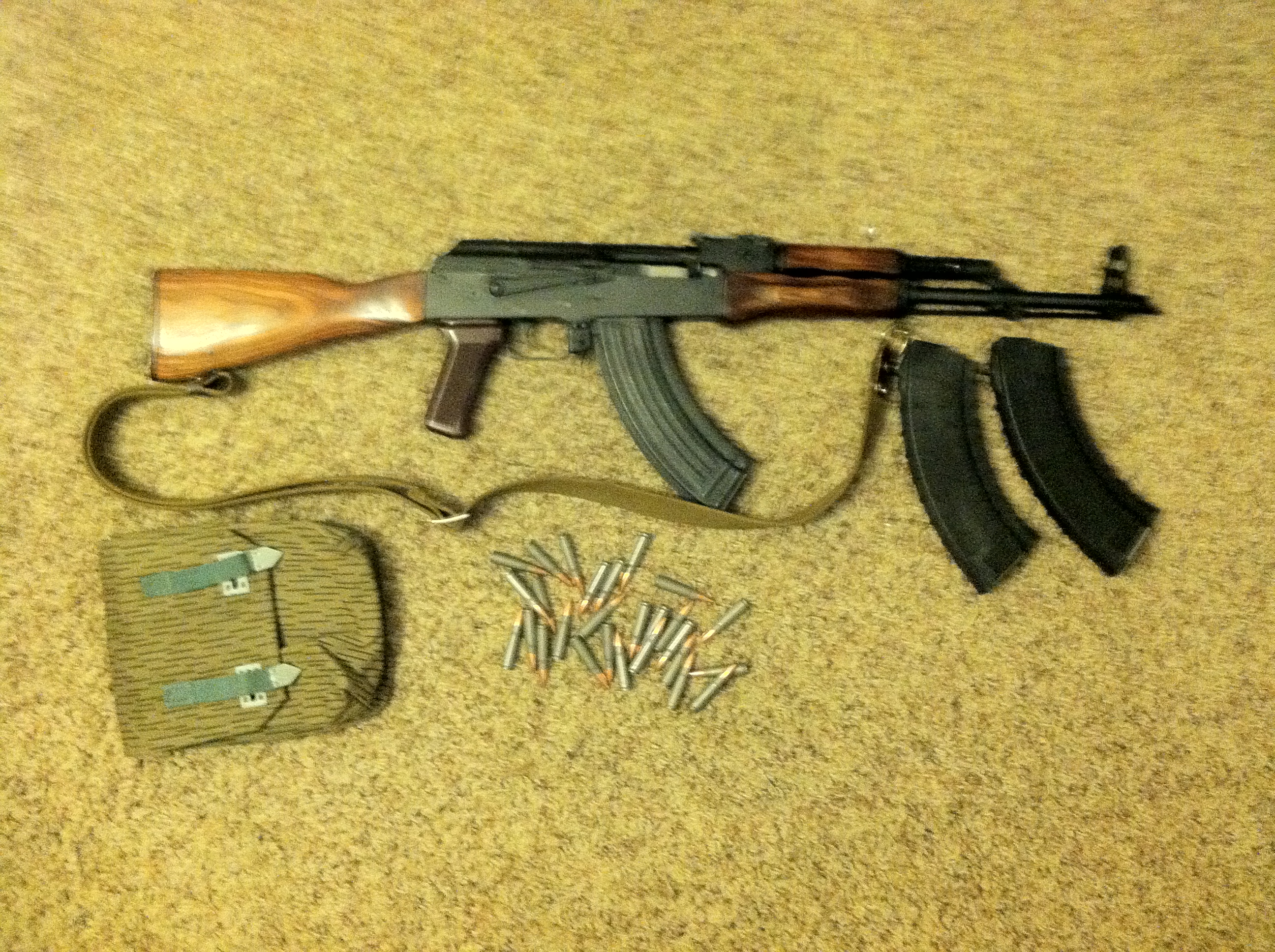 So, I had decided to get a del-ton and was about to go get it when another deal was brought to my attention. Basically, One of my buddies needed a couple hundred dollars worth of textbooks that I had. Instead of him buying them elsewhere, I just gave him the books along with a few bucks and he gave me his AK-47. With the money I had leftover I bought a 1911. I decided that when I get an AR I want to spend enough money where I could get my gun to where I want it, and I don't think I was able to do that just yet. So, I've included some pics of my guns. One is of my Mosin, which I refinished. The other is of my AK-47 with an East German ammo pouch and the final is of my 1911 chambered in 45 ACP.